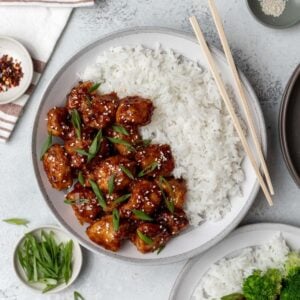 Skip the deep fried Chinese takeout and make this healthier General Tso's Chicken at home in just 30 minutes using the air fryer! Crispy chicken bites are tossed in the most flavorful sweet and spicy sauce. Serve with my fluffy Sushi Rice or Chicken Fried Rice. Or, try my Air Fryer Orange Chicken for a less spicy, kid-friendly takeout dish.
