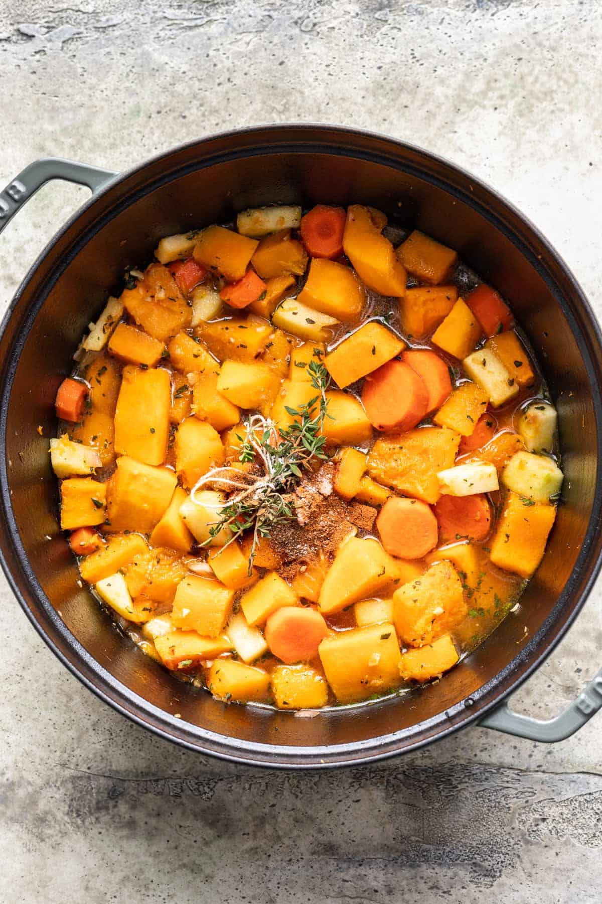 Make sure all veggies are submerged in the broth after you pour it in. Depending on the size of your pot, you may need to add a splash or two more to help the squash fully soften.