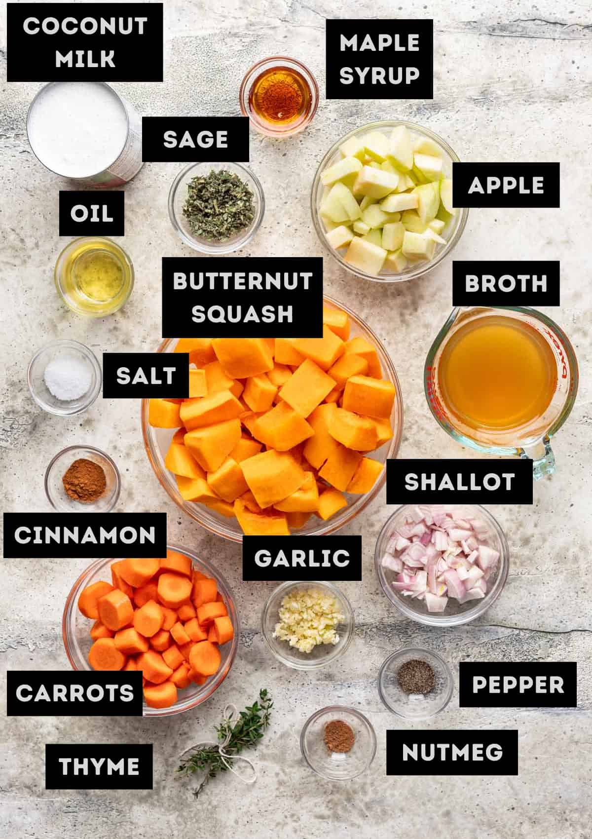 - Butternut Squash: Butternut squash is the main ingredient of this soup. It adds a rich and creamy texture when pureed. It's also full of great vitamins and minerals!
